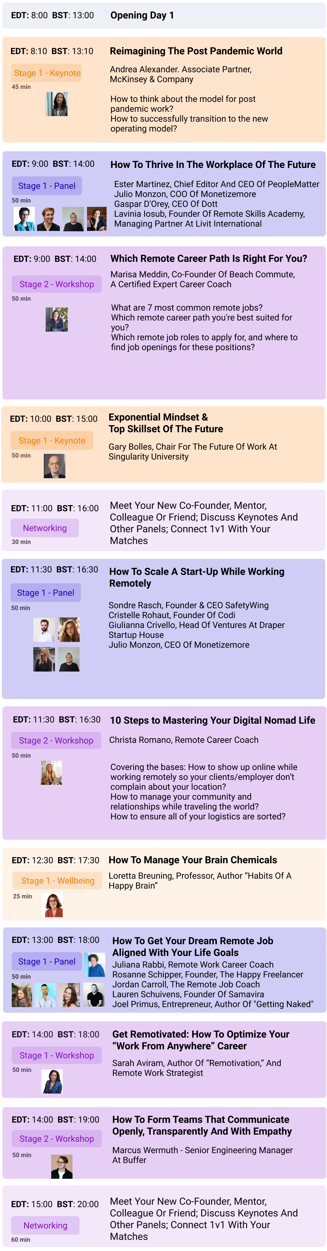 The content is designed for you to learn hands-on remote work tools and career strategies at the workshops, get new knowledge and perspective on disruptive the new normal trends during the panel discussions, get inspired by speakers’ stories, and recharge at the wellbeing sessions.