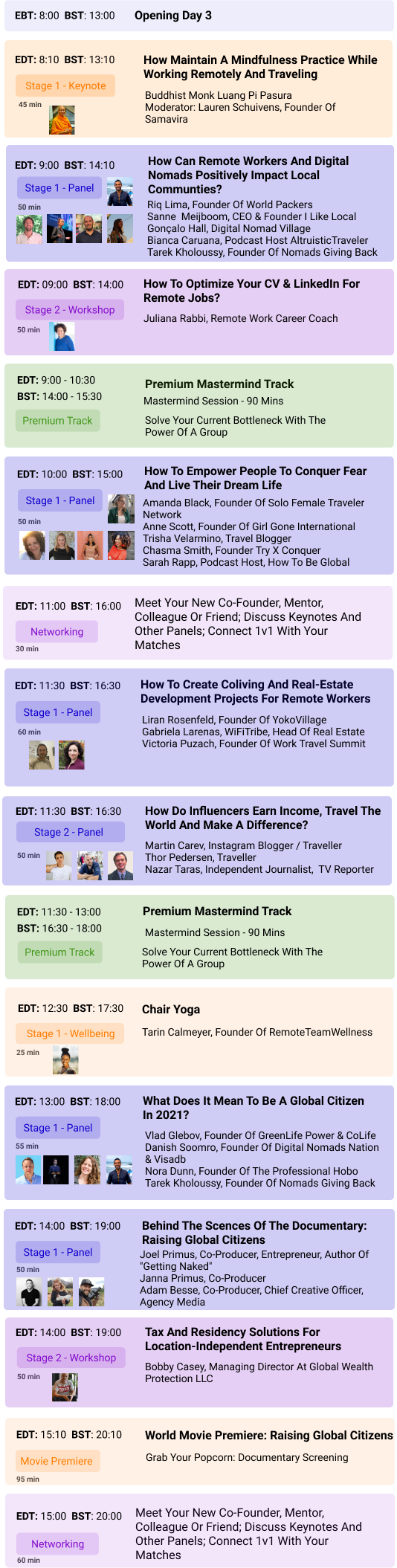 Lifetime Access to the recordings of ALL 4 days: 30+ hours of practical content on remote career, future of work, nomadic lifestyle, and much more.